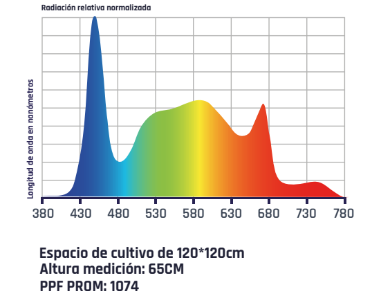 Con 2268 LEDs blancos, 288 LEDs 660 nm SMD2835 de alto flujo y 96 LEDs 730 nm, este equipo proporciona una distribución homogénea con alto impacto en crecimiento y floración. Su estructura modular, con dos drivers IP65 y sistema RJ12, permite un control total en cadena, ideal para configuraciones profesionales.